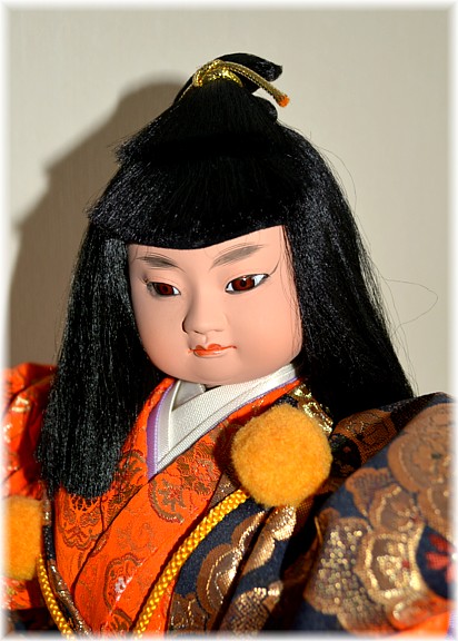 хакама. Мальчик стоит держа в руке военный шлем кабуто.